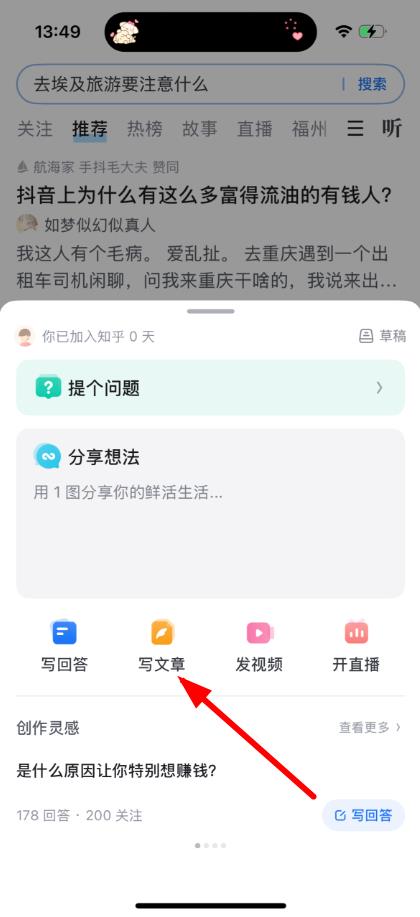 2、在弹出的菜单中,点击写文章选项进入写作页面。