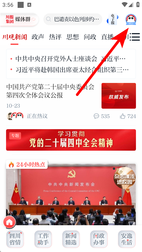 1、在川观新闻首页,点击右上角头像图标,进入个人功能页面。