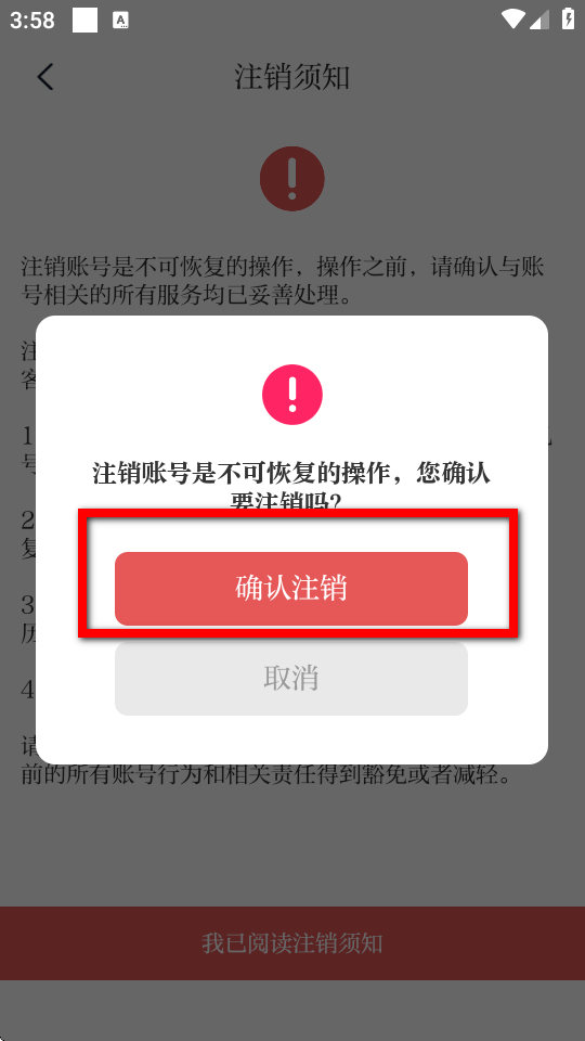 4、在注销须知页面,点击确认注销按钮,即可完成账号注销操作。