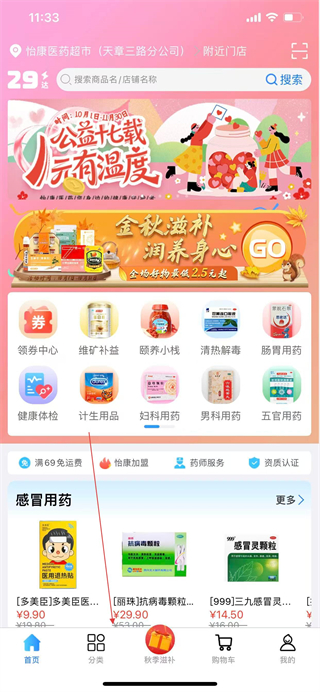 1、打开怡康到家APP,点击底部导航栏中的分类。