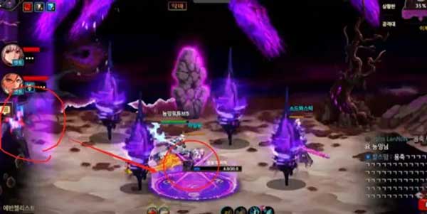 三、Boss在屏幕中间召唤大球,大球下方有个黑色圆圈,同时屏幕两侧会有黄色小球。三个玩家(至少两人)使用角色多次多次往返碰触黄色小球并反复站进屏幕中央的黑色圆圈,读条结束前没有收集到足够黄球,大球落下,全屏秒。