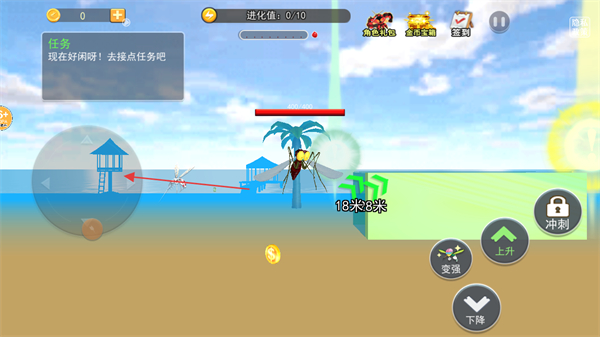 1、操控蚊子在场景中飞行,根据任务提示前往目标区域,准备执行吸血任务。
