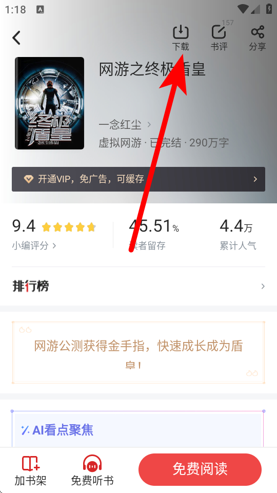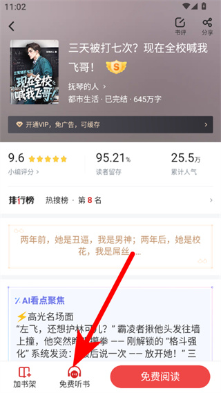 2、在书籍详情页面,点击免费听书选项,进入听书界面。
