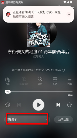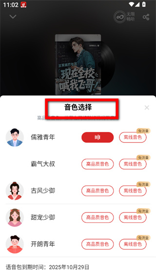 4、在音色选择界面,选择儒雅青年、霸气大叔等音色,即可完成听书声音修改。