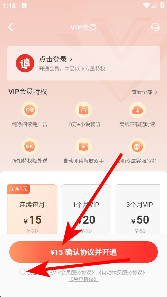 4、勾选同意相关协议后,点击确认协议并开通,开通VIP后即可下载小说。