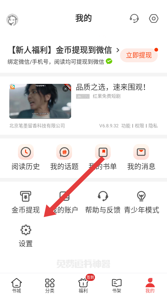 1、在追书神器我的页面,点击设置的图标,进入设置的界面。