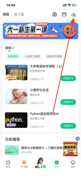 2、在学习页面中,找到并点击右上角的下载图标。
