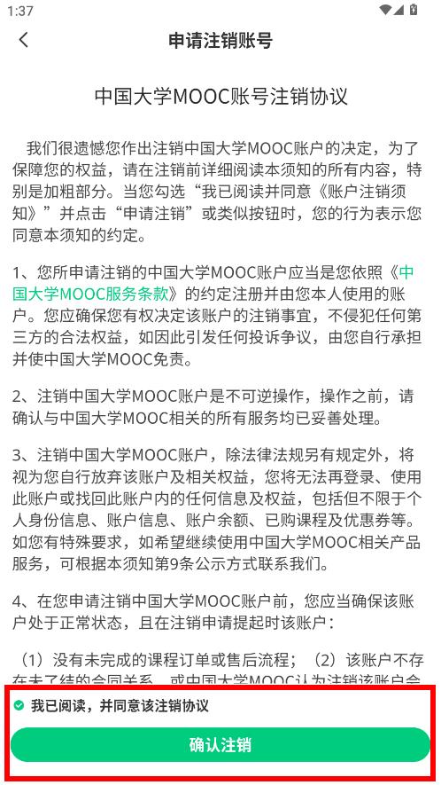 4、勾选我已阅读,并同意该注销协议后,点击确认注销,按后续提示完成账号注销操作。