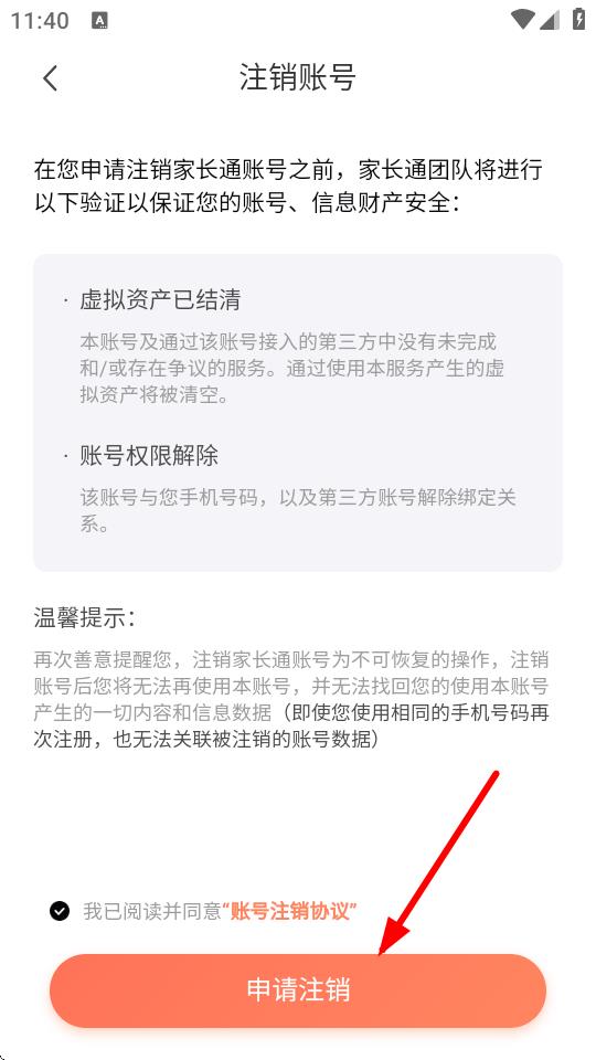 4、在注销账号页面,勾选注销协议后点击申请注销,完成操作。