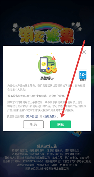 1、在消灭糖果的“温馨提示”弹窗点击“同意”,进入登录方式选择页面。