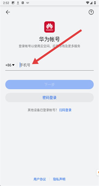 2、在登录账号页面中,点击输入框可以填写手机号,以便获取验证码进行登录。