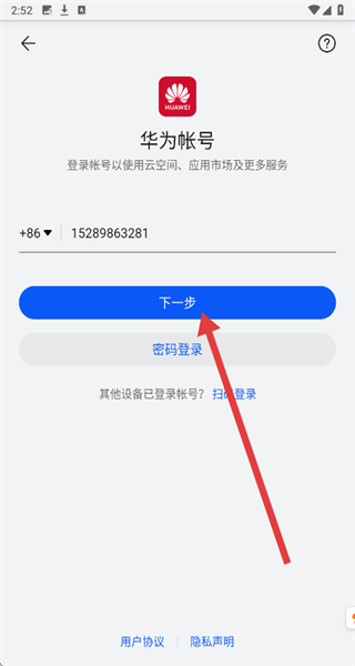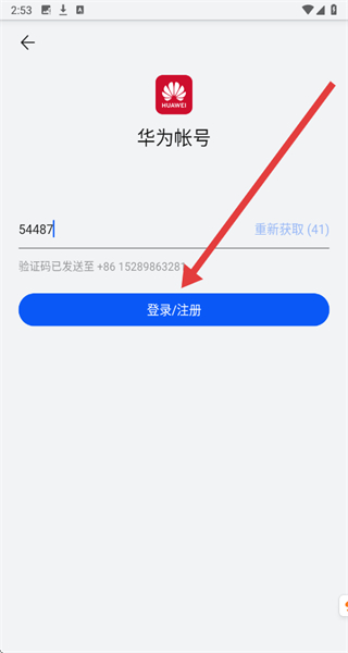 4、在验证码输入页面输入收到的验证码,点击“登录/注册”,完成华为账号登录操作。