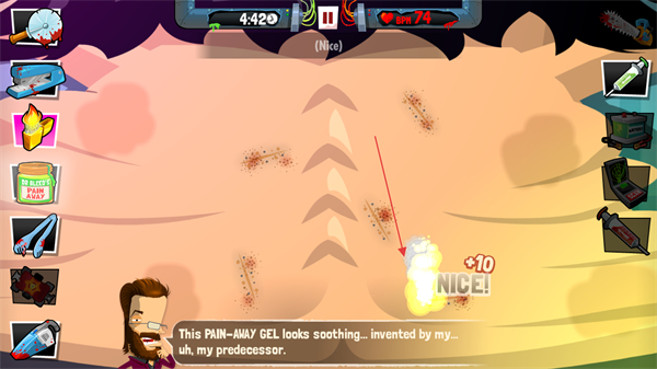 疯狂外科医生4内置菜单是一款风格荒诞搞笑的模拟手术,采用横版2D卡通画风,弱化血腥感呈现轻松氛围,剧情围绕无厘头患者展开,他们有着非同寻常的受伤方式与奇特病情,操作结合全屏滑动与功能按键,使用各类工具完成拔玻璃、钉伤口、涂药膏等手术步骤,后续章节挑战难度会逐步升级。