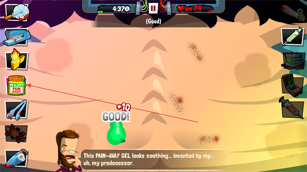 3、选择左侧PAIN-AWAYGEL凝胶,涂抹在伤口处,缓解疼痛并得分。