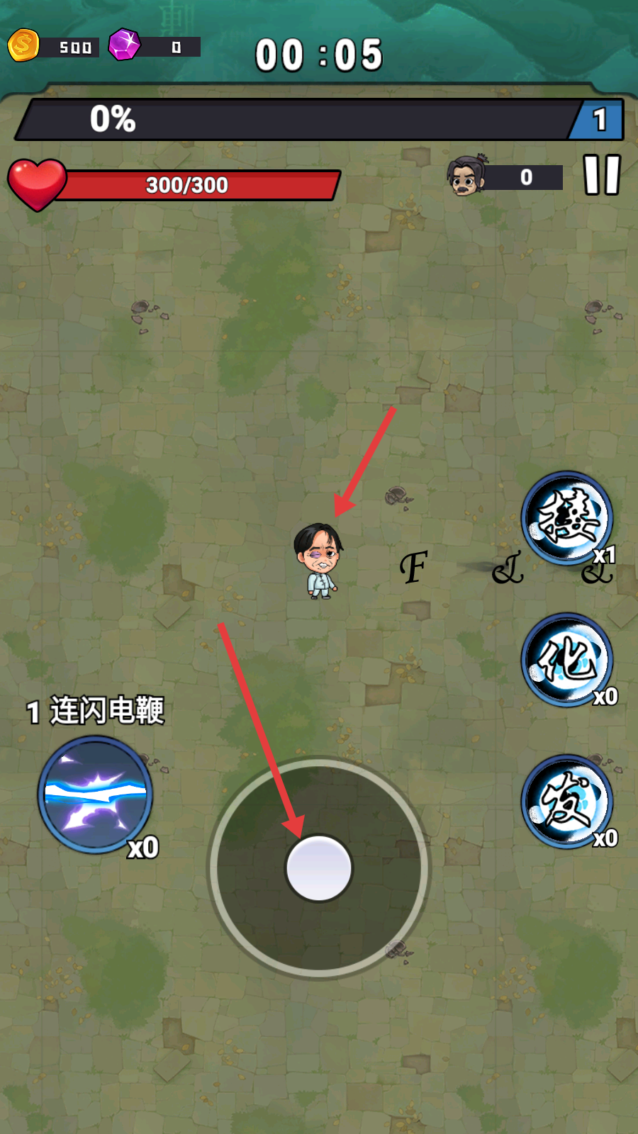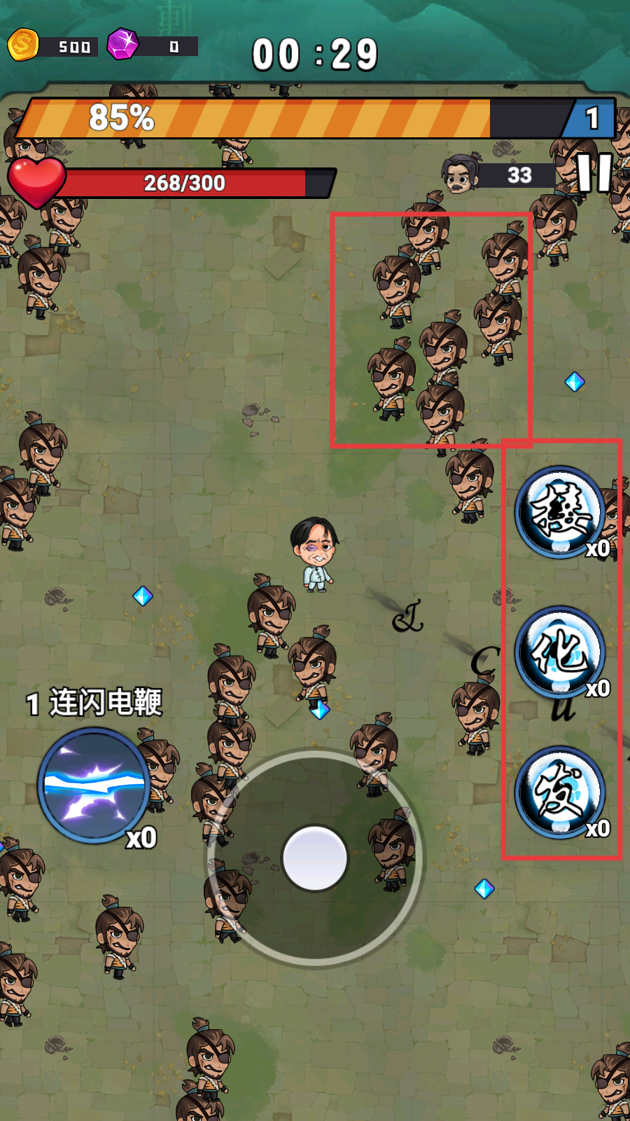 3、躲避或击败围攻的敌人,可使用右侧【德】【化】【发】等技能攻击。