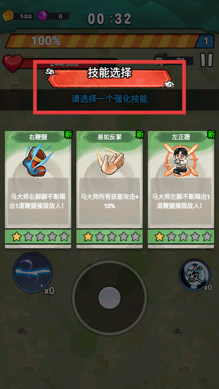 4、【技能选择】时可挑选强化技能,如【右鞭腿】【易如反掌】【左正蹬】。