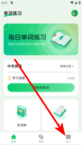 1、打开英语点点跟读,点击底部导航栏练习,进入课程练习页面。