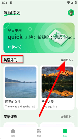 2、在课程练习页面,找到英语外刊板块,点击查看更多,进入英语外刊列表。