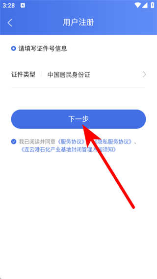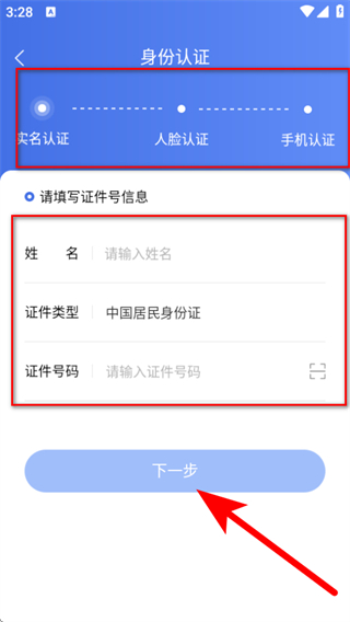 4、在用户注册页面,选择证件类型后点击下一步,进入身份认证页面。