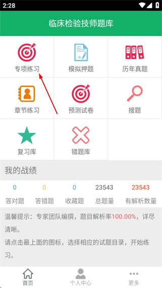 1、打开临床检验技师题库,点击专项练习,可进入专项练习分类页面。