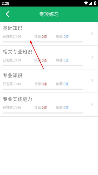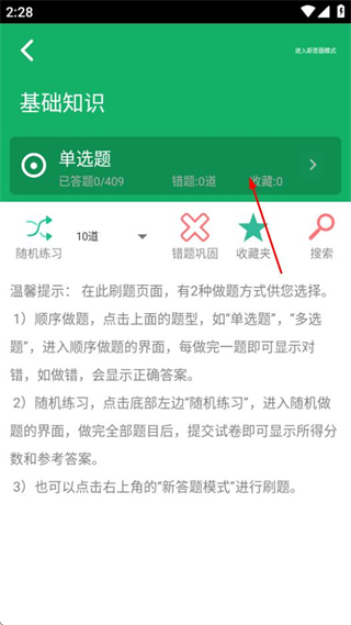 3、在基础知识题型选择页面,点击单选题可进入单选题答题界面。