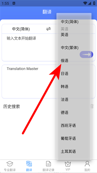 2、在翻译页面,语言选择列表中,选定目标翻译语言。