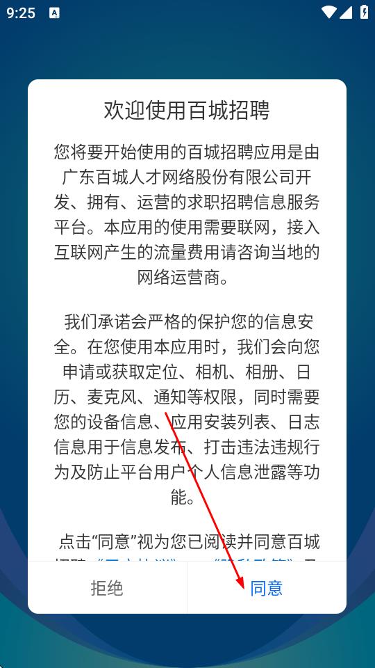 1、打开百城招聘企业版APP,在弹出的欢迎页面点击同意,接受相关使用条款。