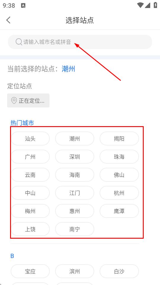 3、在选择站点页面,可以在搜索栏输入城市名或拼音查找城市,或在热门城市列表中选择城市。