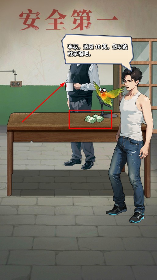 2、将【10萬】-【鈔票】放置在桌上,完成对【李叔】的馈赠,推动剧情发展。