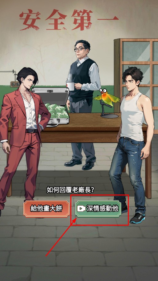 3、选择【深情感動他】选项无需看视频,回应【老廠長】,推进对话剧情。