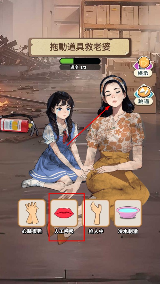1、拖动【人工呼吸】道具到老婆处,完成该救援步骤。