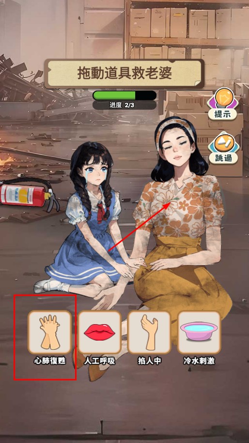 2、拖动【心肺复苏】道具到老婆指定位置,推进救援进度,完成救援阶段。