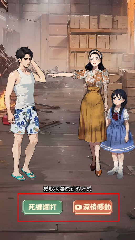 3、在获取老婆原谅的选择中,点击【深情感动】或死缠烂打选项,推进原谅剧情的发展。