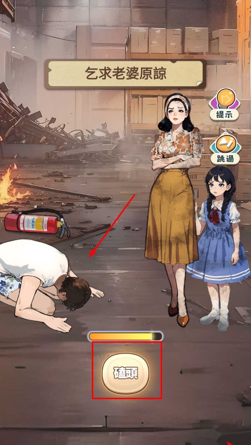 4、乞求老婆原谅时,点击【磕头】按钮,依据进度条提示操作,完成乞求原谅的环节。