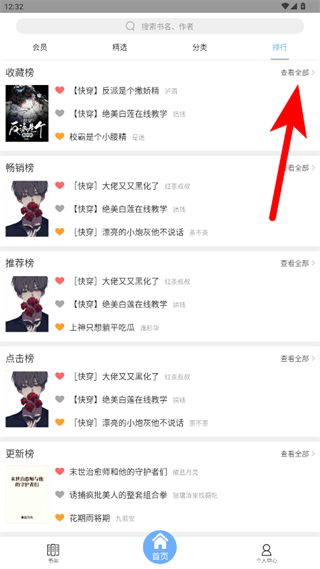 2、在排行页面选择榜单类型如收藏榜,点击查看全部,进入榜单详情页。