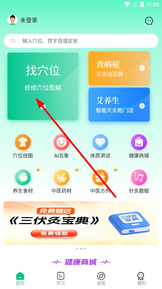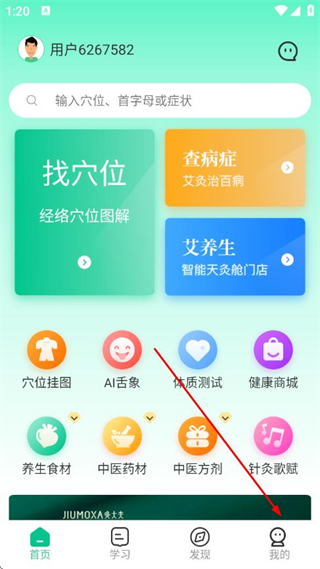 1、打开APP首页,点「找穴位」,可查身体各部位经络对应穴位,了解艾灸作用。