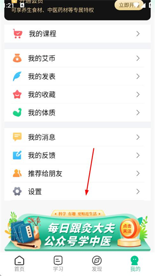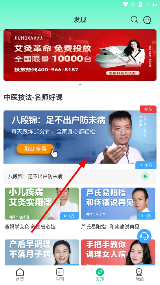3、切到底部「发现」,在「中医技法·名师好课」选感兴趣内容,点课程封面的按钮,就能看专业老师的艾灸、养生教学视频。