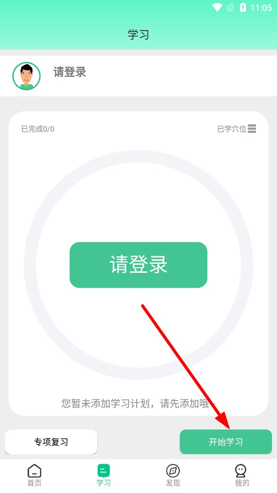 2、点底部「学习」,先登录账号,再点「开始学习」,添加学习计划,系统教艾灸穴位、手法等基础。