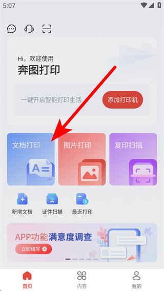 1、打开奔图打印APP,在首页我们可以选择点击文档打印。