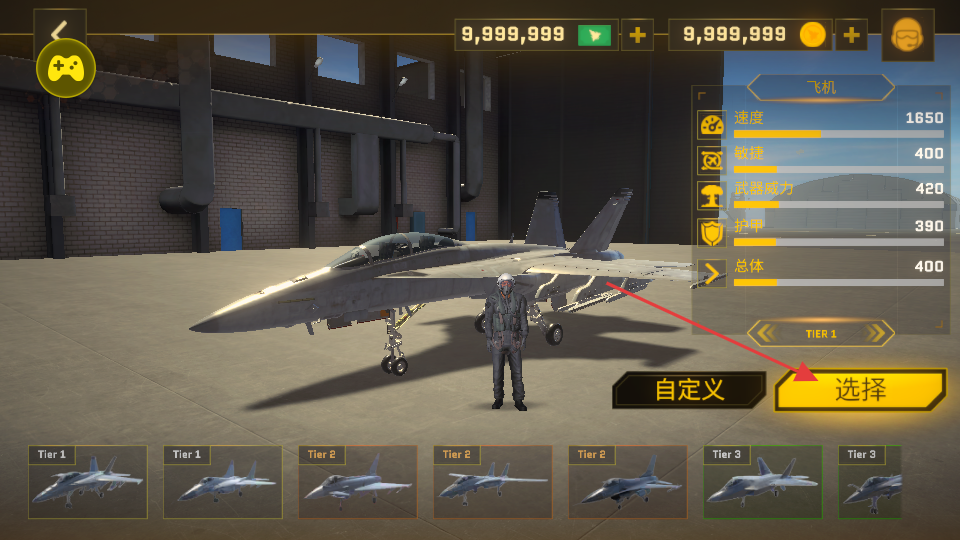 1、在战机选择界面,可查看不同等级战机的速度、敏捷、武器威力等属性,选择“选择”按钮确定战机,开启空战任务。
