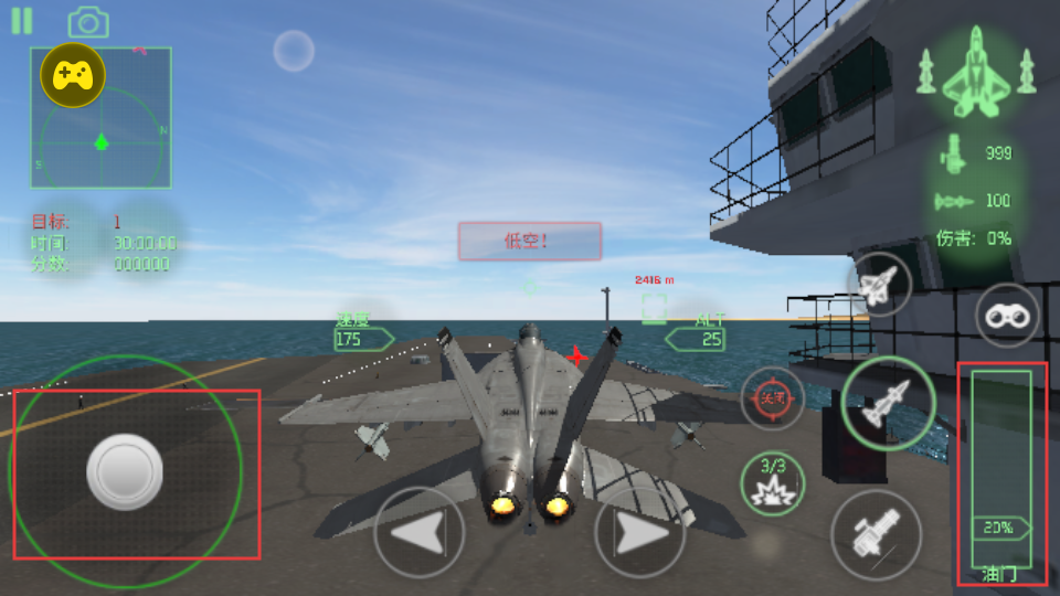 2、通过左侧虚拟摇杆控制战机移动,右侧油门,关注雷达和目标提示,调整油门控制战机速度和高度,确保飞行稳定。
