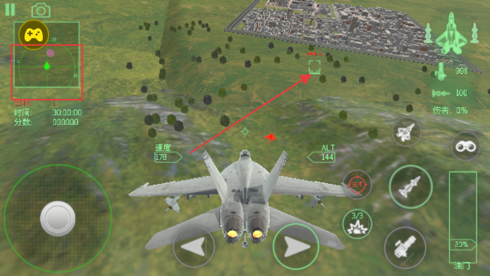 3、飞行中利用雷达追踪目标位置,根据场景调整飞行路线,精准锁定并打击敌人,积累任务分数。