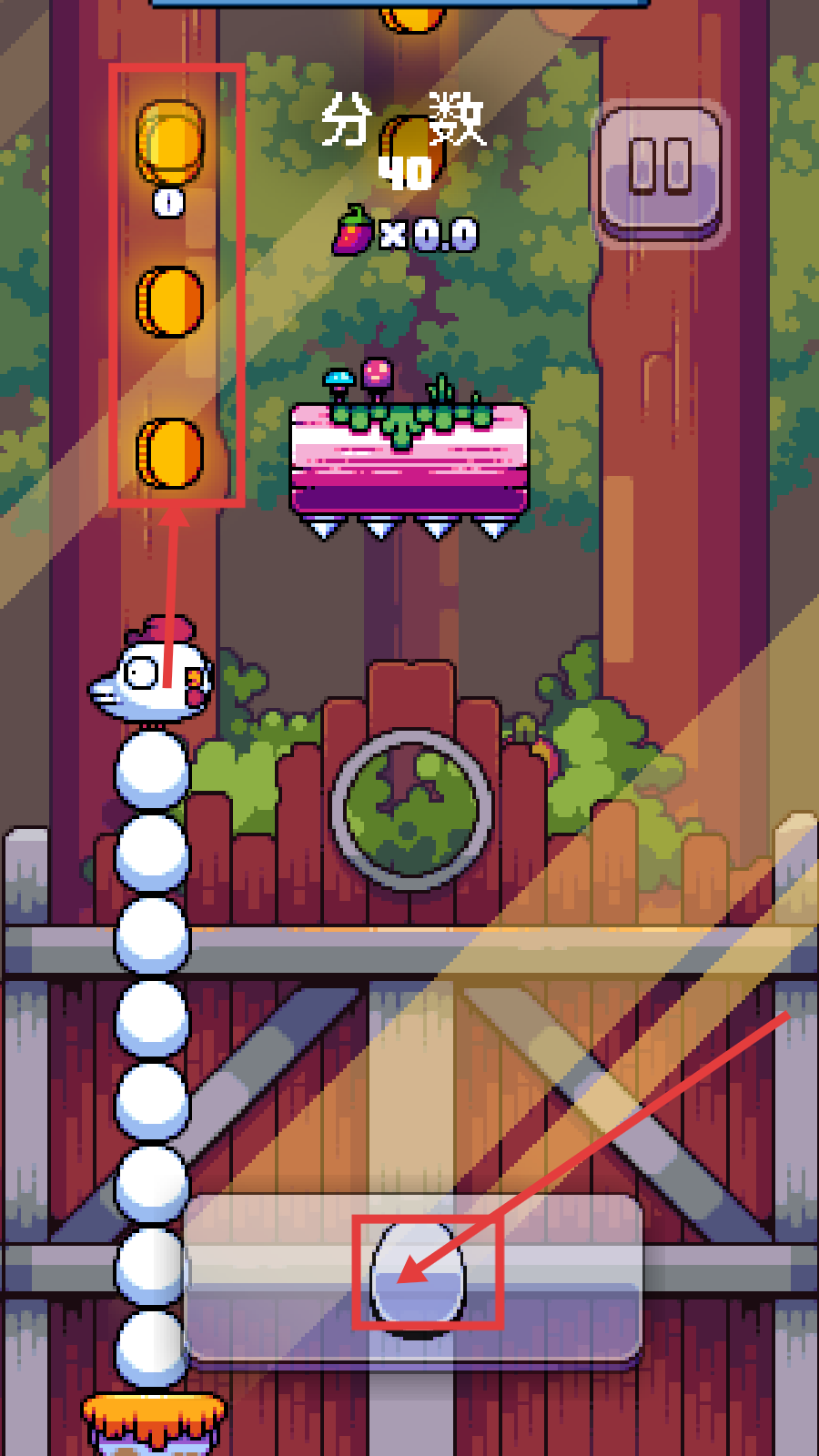 2、游戏中操控下方蛋型按钮,收集左侧金币,提升分数至40,积累资源。