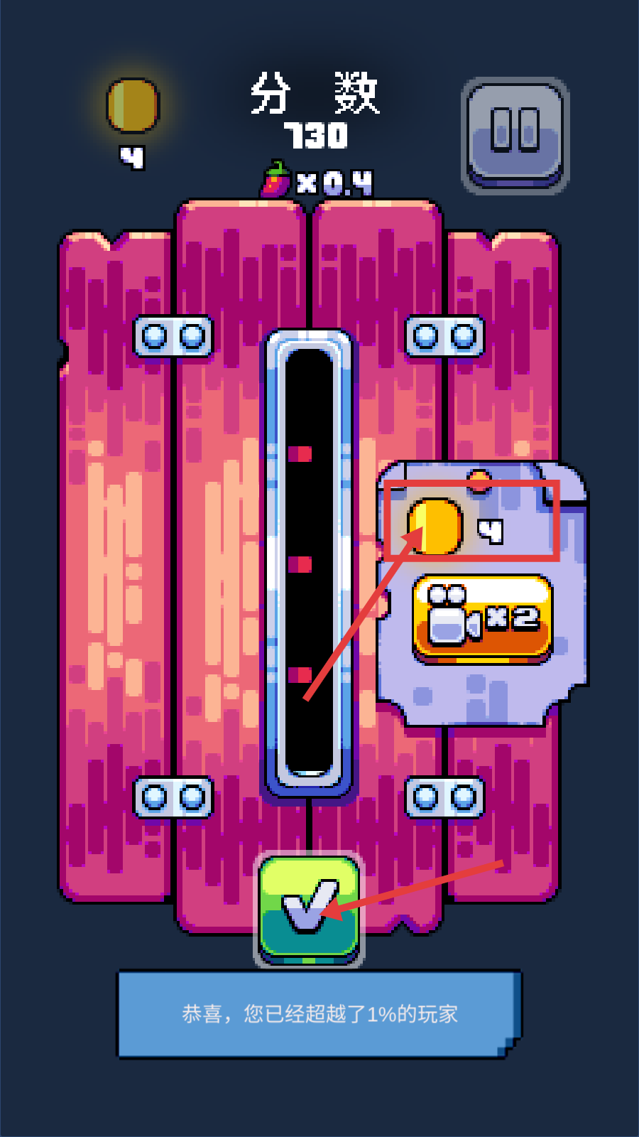 4、关卡结算时收集金币,点击对勾按钮完成关卡,分数达730,超越1%玩家,推进游戏进程。