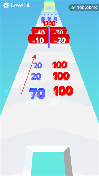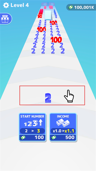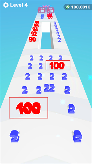 2、进入关卡后,操控数字在跑道上移动,优先收集比自己小的数字并且逃离比自己大的,进行合并升级。
