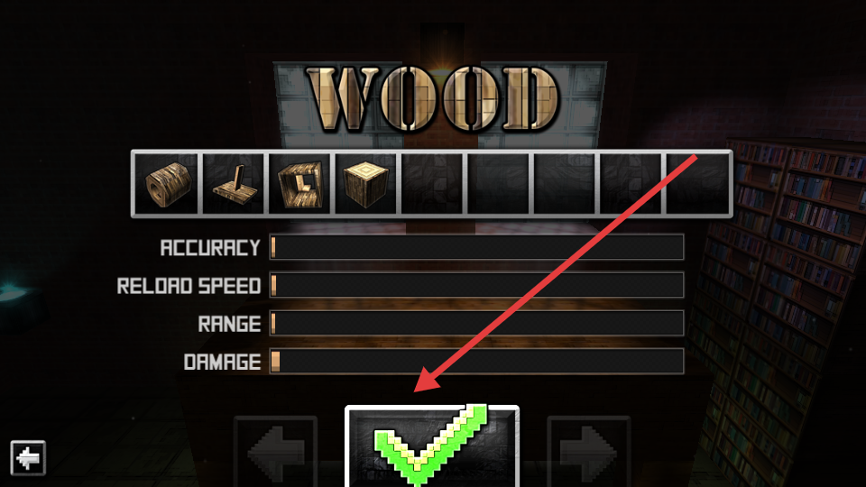 1、在木材属性界面,可查看并确认木材的精度换弹速度、射程、伤害等属性,点击绿色对勾确认选择,用于建筑或武器制作。