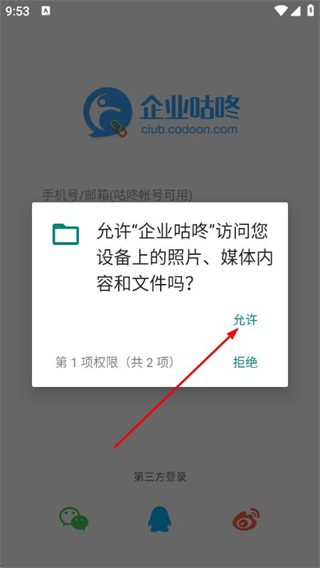 1、打开企业咕咚APP,在权限请求弹窗中点击允许。