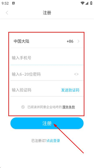 3、输入手机号码、设置密码、输入验证码,勾选服务条款,点击注册。