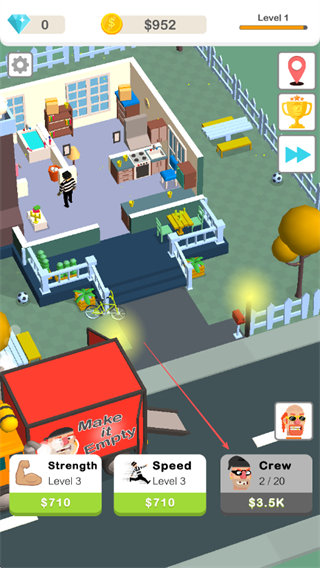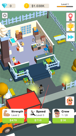猛男搬家无限金币是一款抢劫题材的模拟放置作品,玩法聚焦快速洗劫场景与放置收益循环,控制劫匪在警察到达前尽可能短时间内搬空场景物品,每个新关卡需提升劫匪的数量、力量与速度,通过放置操作获取收益,再用收益强化效率形成良性循环,助力尽快完成当前关卡,同时包含随机任务、排行榜等辅助娱乐功能,丰富整体娱乐体验。