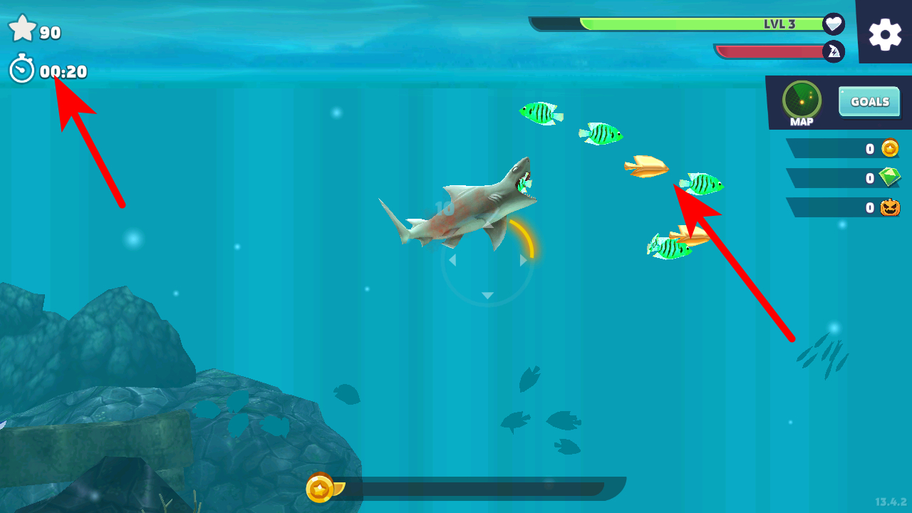 3、在海洋中优先捕食小鱼、弱小动物,积累分数和经验,同时注意游戏时间,在规定时间内尽可能获取高分。